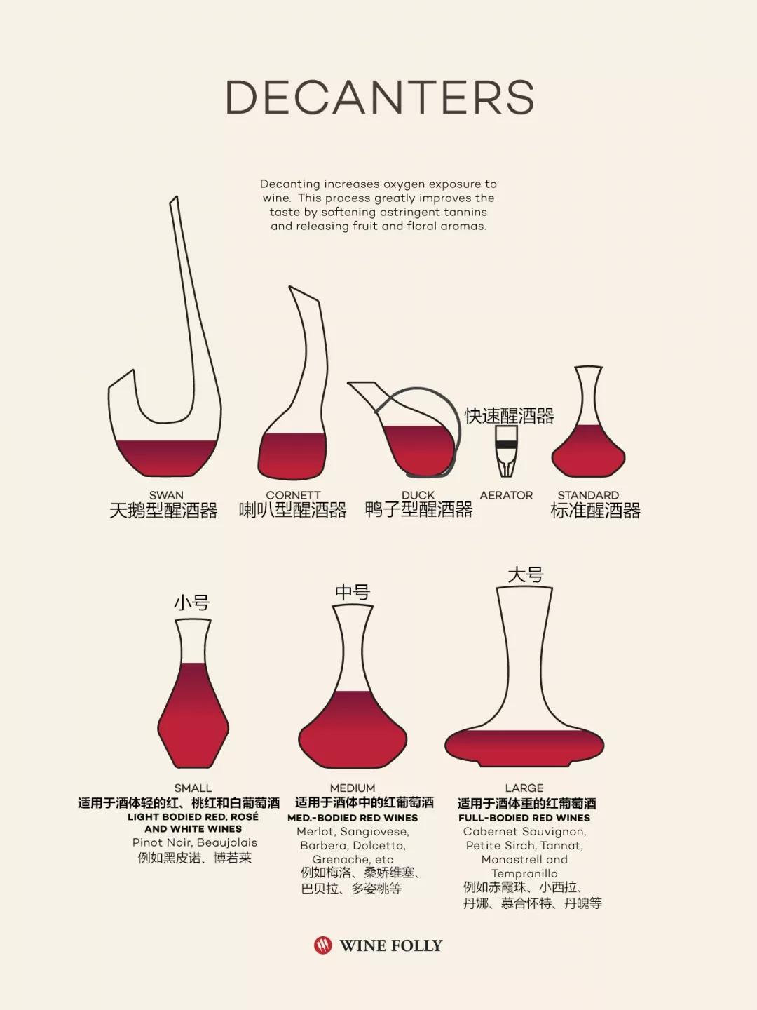 這幾種形狀的醒酒器,基本上滿足了所有葡萄酒的需求。其中,小號的醒酒器也被稱為老酒醒酒器,其表面積較小,適合保護老酒纖弱的香氣和結(jié)構(gòu),年輕、強壯的葡萄酒,則適合中號或大號的醒酒器。