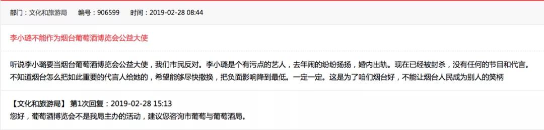 無(wú)獨(dú)有偶,今年初,煙臺(tái)國(guó)際葡萄酒博覽會(huì)想推陳出新,于是邀請(qǐng)李小璐擔(dān)任第十二屆煙臺(tái)國(guó)際葡萄酒博覽會(huì)的公益大使,希望“李小璐將利用她在巨大的粉絲影響力在中國(guó)全力推廣煙臺(tái)酒博會(huì)。”