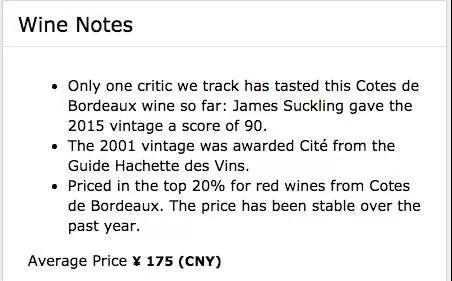 Chateau Lafitte酒莊位于位于法國(guó)C?tes de Bordeaux產(chǎn)區(qū),由Raymond Lafitte創(chuàng)建于1763年。在Wine Searcher上的國(guó)際均價(jià)為175元,James Suckling曾為其2015年份的葡萄酒打了90分。