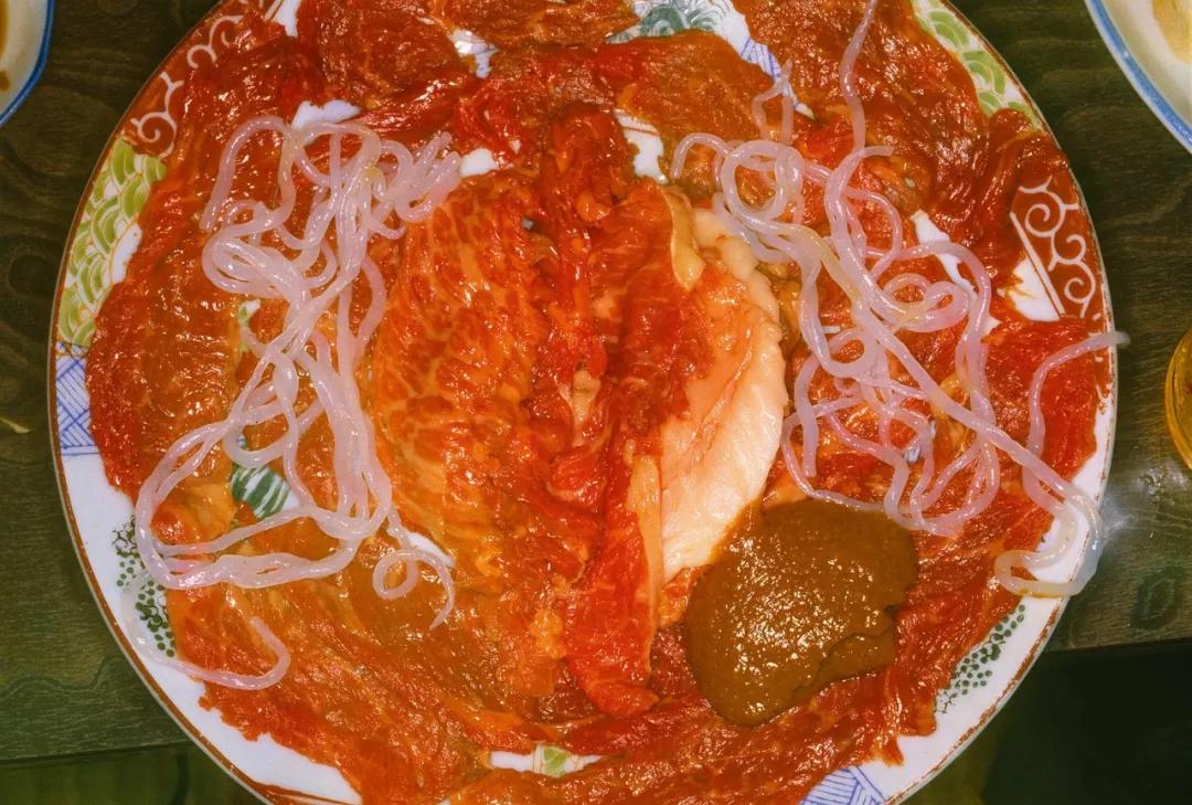 日本攝影家荒木經(jīng)惟有一組名為《盛宴》(The Banquet, 1993)的作品,選取四張,模樣都有點(diǎn)張揚(yáng),其中一盤(pán)最為生猛,能讓一路看過(guò)來(lái)已經(jīng)懷念肉食的觀眾趕緊轉(zhuǎn)頭再看幾眼水果。當(dāng)今的食物照片多數(shù)用于傳播和分享,絕大多數(shù)都以精致面目示人,這樣一組照片通過(guò)近乎冒犯的方式提醒觀眾:不僅食物本身,就連食物的呈現(xiàn)其實(shí)都是多樣的。