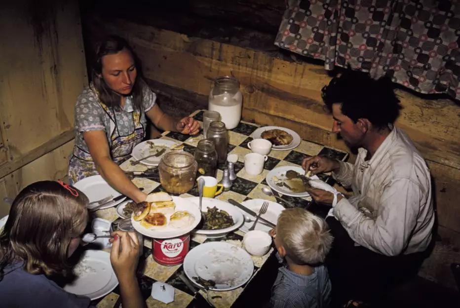 比如,維吉(Weegee)拍攝的《菲利普·斯塔佐在 WPA 上享受他最喜歡的食物,因?yàn)樗?tīng)說(shuō)軍隊(duì)不太喜歡供應(yīng)意大利面》(Phillip J. Stazzone is on WPA and enjoys his favourite food as he'sheard that the Army doesn't go in very strong for serving spaghetti. 1940)以他慣常的戲劇化表達(dá)讓一副普通境界的吃相躍然紙上。維吉鏡頭下的美國(guó)在 1940年尚有一盤(pán)意大利面,拉塞爾·李(Russell Lee)在同一年份走入美國(guó)新墨西哥州的鄉(xiāng)下,便還能看見(jiàn)大蕭條最后的尾聲:小城市普通美國(guó)家庭并不豐盛的晚餐。20年后,同樣在美國(guó),食物上的局促有了很大改觀,但更直觀的窘境達(dá)到了高峰: 種族問(wèn)題。佚名攝影師拍下的《午餐吧臺(tái)的罷工》(Lunch Counter Sit-in) 即顯示了這個(gè)問(wèn)題。兩名美國(guó)黑人大學(xué)生在“只準(zhǔn)白人” (whites-only)的餐廳吧臺(tái)上學(xué)習(xí),兩名白人女服務(wù)員在觀望他們的同時(shí)拒絕為他們服務(wù)。冰冷拒絕且?guī)?,是非常純粹的仇恨表情。四個(gè)人,圍桌,卻沒(méi)有可供享用的食物。種族主義作為曾經(jīng)橫亙?cè)谒麄冎g無(wú)形的高墻,直到今天都還有殘?jiān)珨啾诹舸妫癁榈桶慕O腳石。