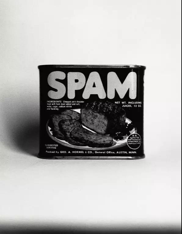 杜瓦諾讓畢加索與面包嬉戲后,另一位波普藝術(shù)家登場(chǎng)。艾德·魯沙(Ed Ruscha) 的《斯帕姆午餐肉》(Spam, 1961)與安迪·沃霍爾的《金寶湯罐頭》(Campbell's Soup Can, 1962)有異曲同工之妙。去掉顏色的午餐肉好像還顯出一絲正色,不像它代表的快餐文化那樣輕浮。