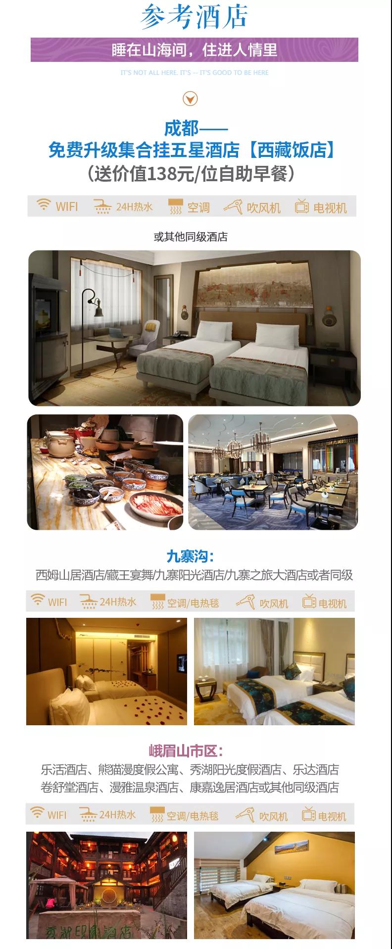 ? 住宿:含全程5晚舒適酒店標(biāo)間,免費(fèi)升級(jí)2晚成都集合掛五酒店(西藏飯店)。參考酒店如下: