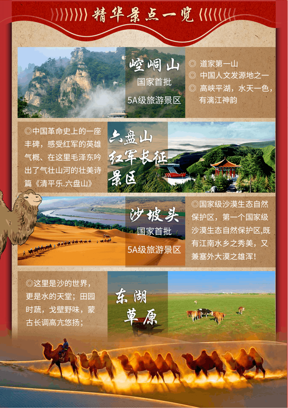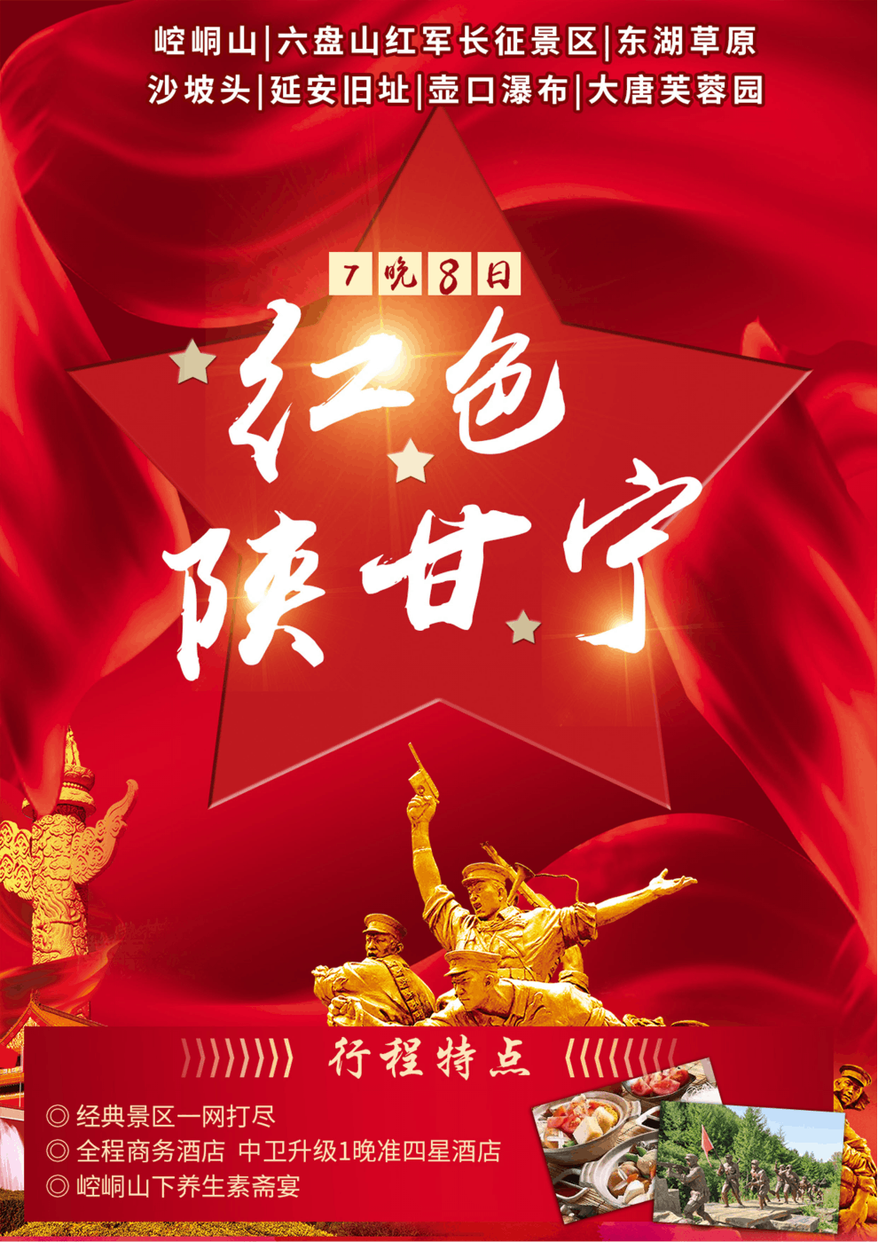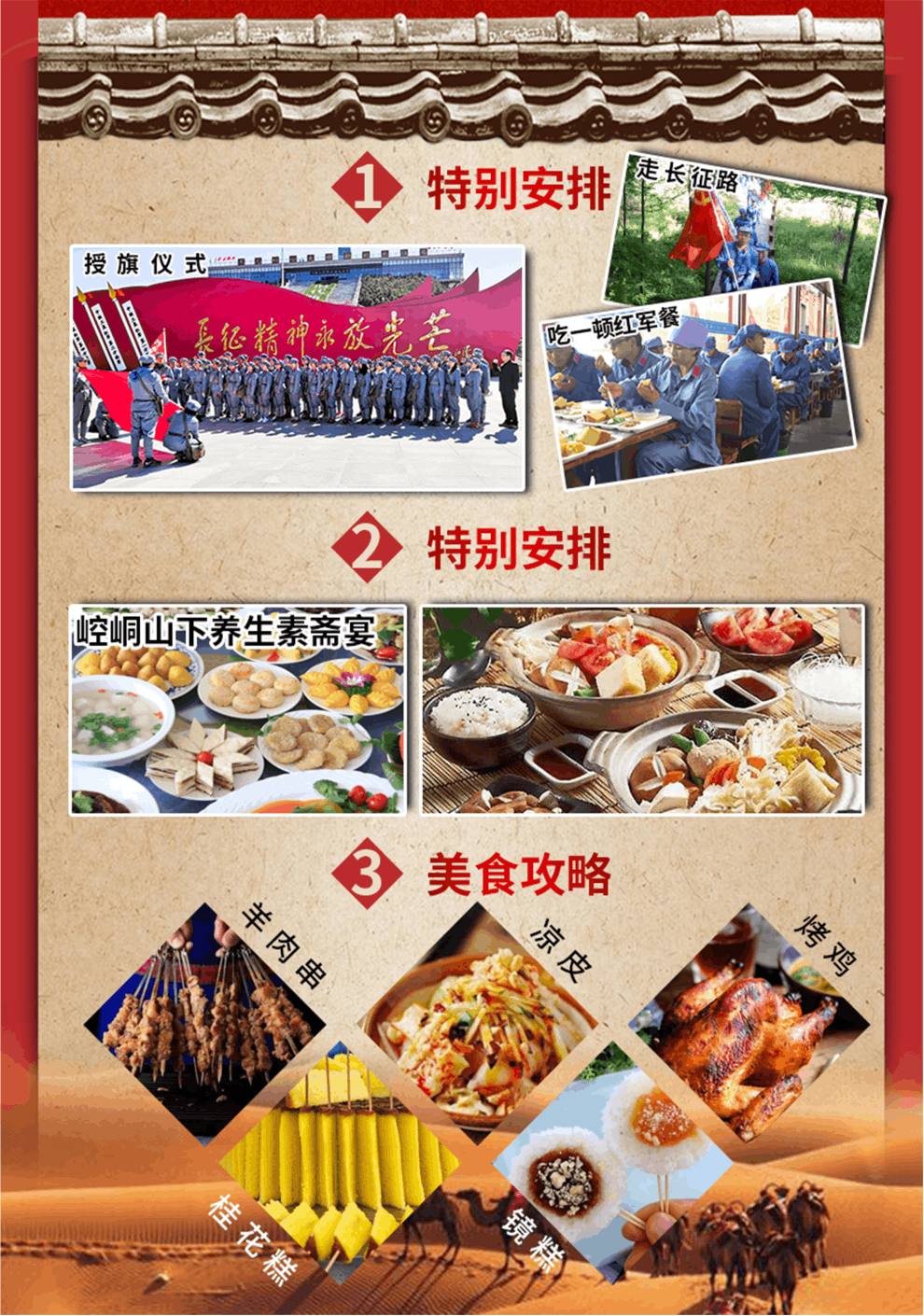 特別安排:【授旗儀式】—到達景區(qū),換上紅軍服裝,按照長征中紅一、紅二、紅四方面軍的編制,分為三隊。由活動領(lǐng)隊致辭,向各隊隊長授旗!大家齊聲朗誦《清平樂.六盤山》,伴著“不到長城非好漢”的壯志豪情,高舉紅軍旗,身著紅軍服向山頂進發(fā)。