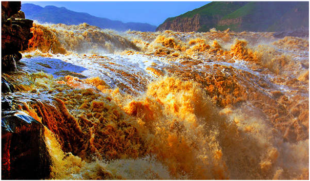 滔滔黃河,自青海源頭東流經(jīng)甘肅、寧夏,在內(nèi)蒙古河口鎮(zhèn)受呂梁山脈阻擋,轉(zhuǎn)南進(jìn)入秦晉峽谷。黃河流域到此似乎厭倦了一路的平緩,突然斂水成束,一頭扎進(jìn)這40米深的形似壺口的石槽中,剎那時(shí)這洶涌的急流,怒吼的洪波撞開(kāi)了一幕千古奇觀。這水,勢(shì)如排山倒海,驚天動(dòng)地;疾如萬(wàn)馬奔騰。頃刻間,猶如天河從天而來(lái)。