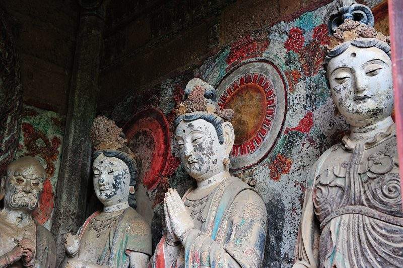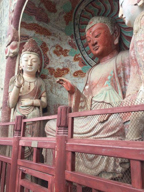 麥積山的洞窟很多修成別具一格的“崖閣”。在東崖泥塑大佛頭上15米高處的七佛閣,是我國(guó)典型的漢式崖閣建筑,建在離地面50米以上的峭壁上,開鑿于公元6世紀(jì)中葉。麥積山石窟雖以泥塑為主,但也有一定數(shù)量的石雕和壁畫。麥積山石窟被列為國(guó)家重點(diǎn)文物保護(hù)單位,新架和修復(fù)了1300多米的凌空棧道,使游人能順利登臨所有洞窟。麥積山石窟的造像最高大者達(dá)16米,最小者僅為10余厘米。其中第44窟造像被日本人稱為“東方的維納斯”。西秦的78窟 、128窟的造像的僧衣細(xì)致地繪出了圖案。建于七十余米高的的七佛閣上塑像俊秀,過道頂上殘存的壁畫精美絕倫,其中西端頂部的車馬行人圖,無論從哪個(gè)角度看車馬所走方向均不相同,堪稱國(guó)內(nèi)壁畫構(gòu)圖之經(jīng)典之作。