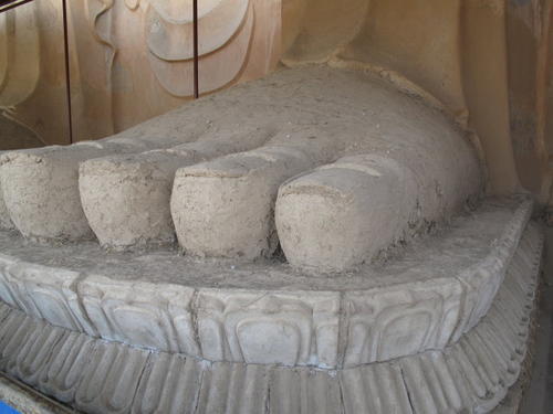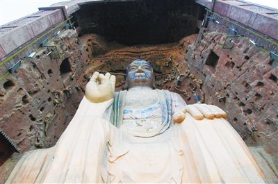 甘谷大佛石窟造象可遠(yuǎn)溯至北魏,具體年代已經(jīng)無從稽考。現(xiàn)存釋迦牟尼大佛像始鑿于北魏,一直到盛唐才趨完美。大佛石胎泥塑,身高23.3米,腰闊10.4米,結(jié)跏跌坐于蓮座之上,高大魁梧,溫順善良,坐于30.2米高、窟頂呈圓拱形的石窟內(nèi),頤面豐滿,肉髻高突,兩耳下垂,頸短并飾三道弦紋,短須作蝌蚪狀,施拔濟(jì)眾生印,足踩豐蓮??邇?nèi)還殘存懸塑達(dá)摩、頻伽、飛天、卷云、蓮葉等,栩栩如生。