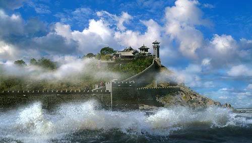 進(jìn)入仙境自然有神仙顯靈,現(xiàn)在大家看到的就是顯門(mén)。顯靈門(mén)是天后宮的宮門(mén)。天后宮里供奉的是海神娘娘,過(guò)去漁民最崇敬的就是海神娘娘,常來(lái)這里祈禱海神娘娘保佑出海平安無(wú)事。我們先往西走,到龍王宮去參觀一下。唐貞觀年間在山頂建有龍王廟,宋嘉佑六年移至現(xiàn)在的地方,現(xiàn)在大家看到的龍王宮是1984年重建的。走進(jìn)龍王宮的前殿,大家看到的呢東為定海神,西為靖海神。他們可是龍王的左右護(hù)法。