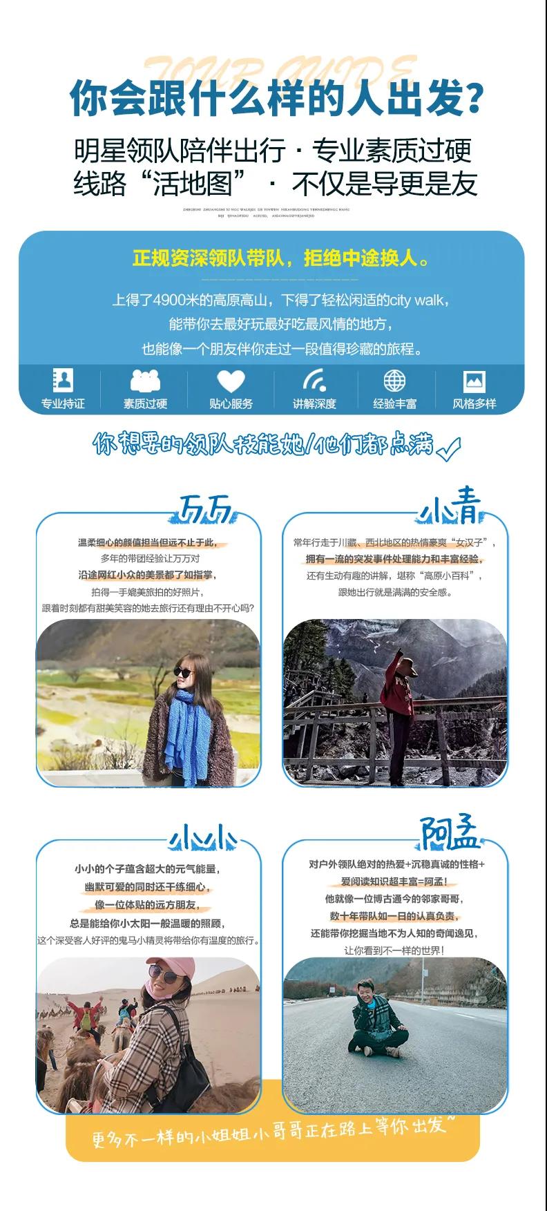 7、導游服務:8人及以上提供正規(guī)持證專業(yè)導游服務;8人以下,由經(jīng)驗豐富的司機提供向導服務。
