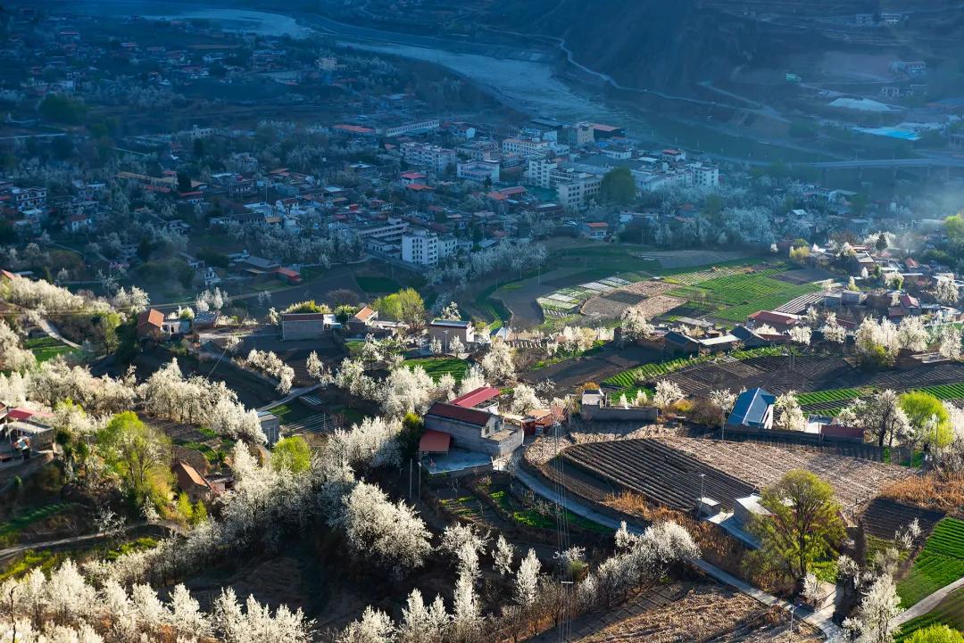 我們的團期是金川最好的時節(jié),萬物復蘇的初春三月,正值金川成千上萬棵梨樹花期,雪白色的梨花競相開放,一片片、一層層的鋪散開來,漫山遍野的白色花海中夾雜零星新綠,空氣中氤氳著梨花清香,眼是天堂,身亦是天堂。