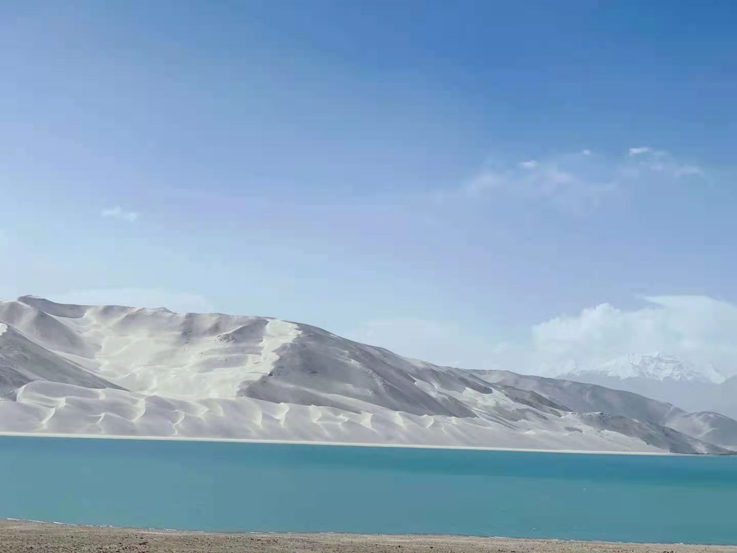 車(chē)子行進(jìn)在海拔三千多米的【蓋孜峽谷】中??龉废褚粭l玉帶,沿著蓋孜河在蓋孜峽谷中穿梭著,眼前的景色又變成了綿延不絕的荒山雪嶺。此時(shí)突然出現(xiàn)的美麗湖泊便是【布倫口白沙湖】湖水在帕米爾高原潔靜的陽(yáng)光下,閃耀著金屬般的光澤。湖水在天空、白沙和雪山的綜合作用下呈現(xiàn)出一種別樣的藍(lán)。