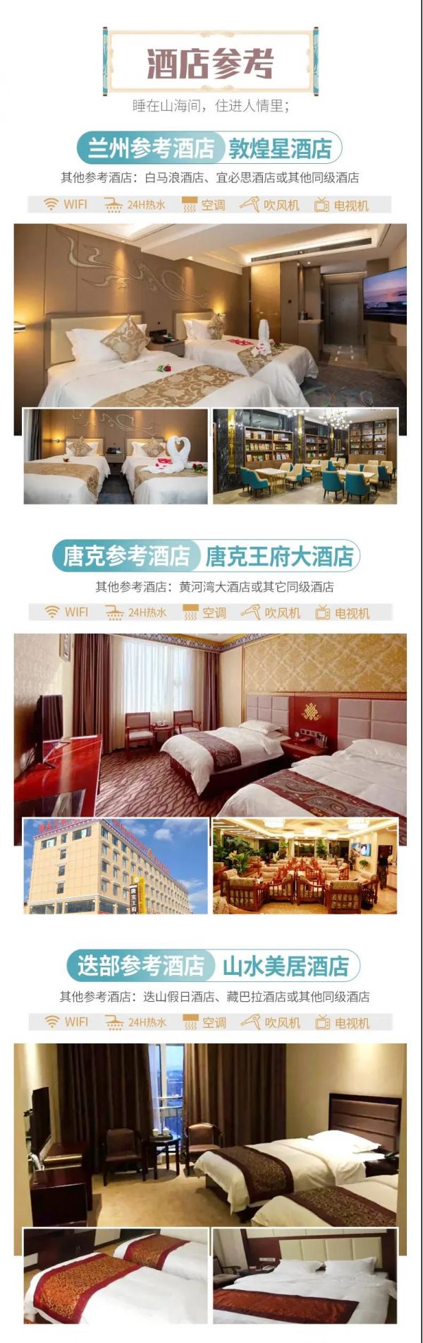 住宿:6晚當?shù)鼐肪频?,確保酒店干凈衛(wèi)生,溫馨舒適。因沿途高原藏區(qū)條件有限,如果酒店設(shè)施沒有達到您的期望,敬請諒解。參考酒店如下: