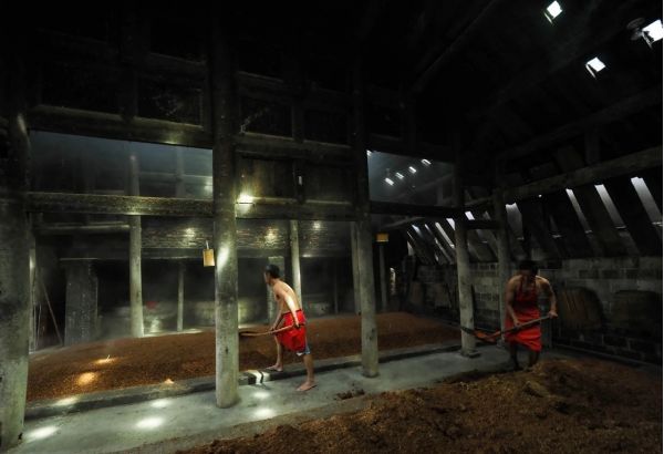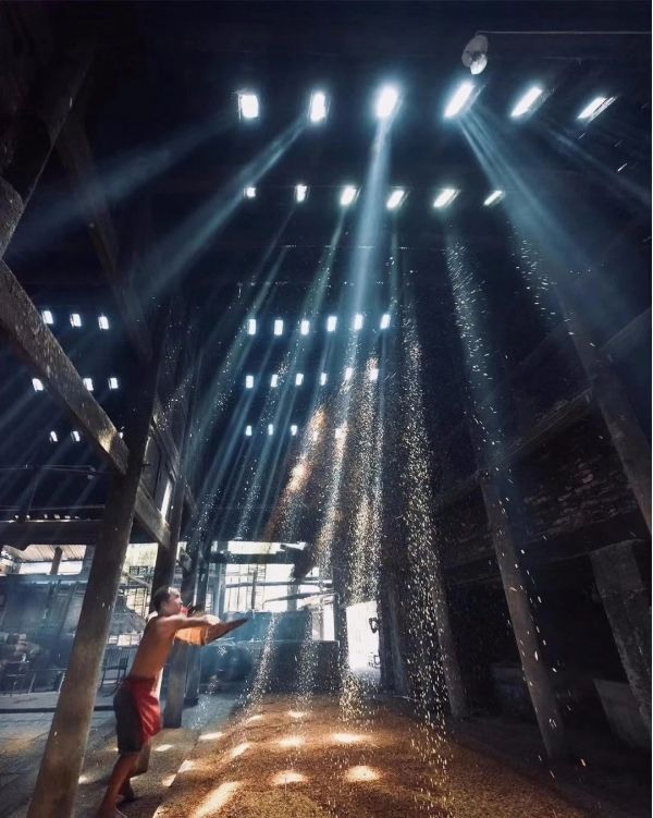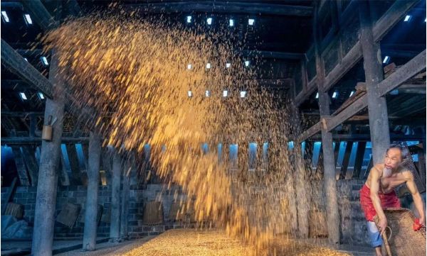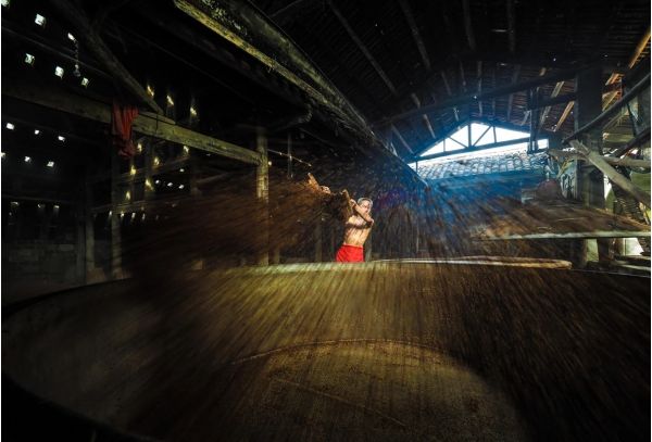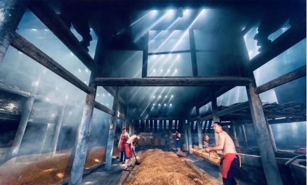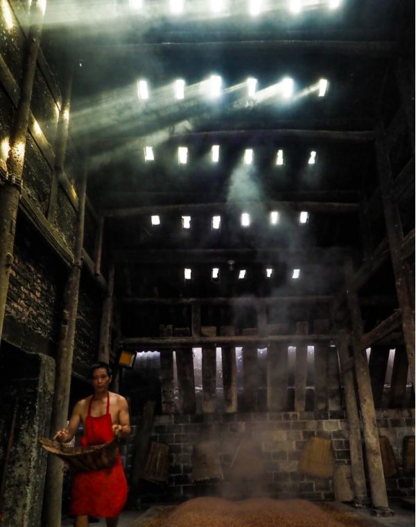 拍攝有著百年歷史的傳統(tǒng)手工藝—泡子酒,迎合著紅高粱霧蒙蒙蒸汽,仿佛置身于行宮騰云般壯觀??揪茙煾祩兌酥圃愦┧笮凶?,或激情揮灑酒曲之間,所到之處,散發(fā)著一種勞動(dòng)之美,力量之美。將近午時(shí)光束穿透老屋頂,投射到古老的作坊,這里便是暈染了熱騰騰的場景。