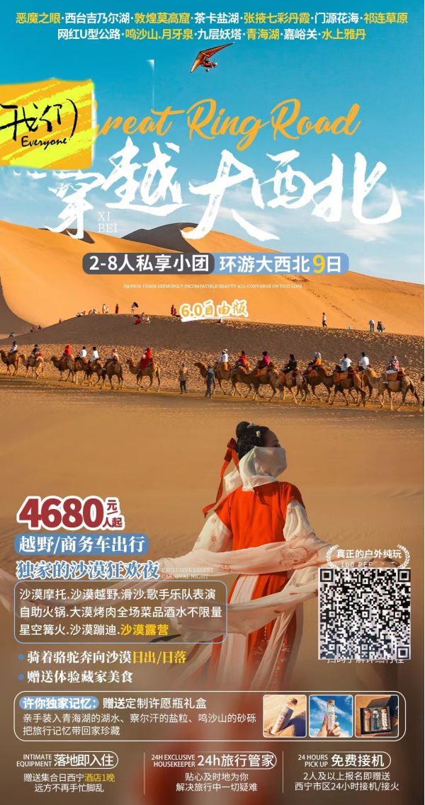 如果讓我們推薦一條去- -次抵十次的旅行路線,那一定是西北大環(huán)線!沙漠、戈壁、雪山、草原、花海、湖泊、石窟、雅丹、丹霞...這些看似無法兼容的美景,全部都真實(shí)匯聚在這條線路.上!,我們深耕大西北多年,不斷打磨迭代升級(jí)推出西北大環(huán)線6.0版本,保留最經(jīng)典的風(fēng)景,解鎖小眾高顏值景點(diǎn)給你最難忘的大西北旅行。