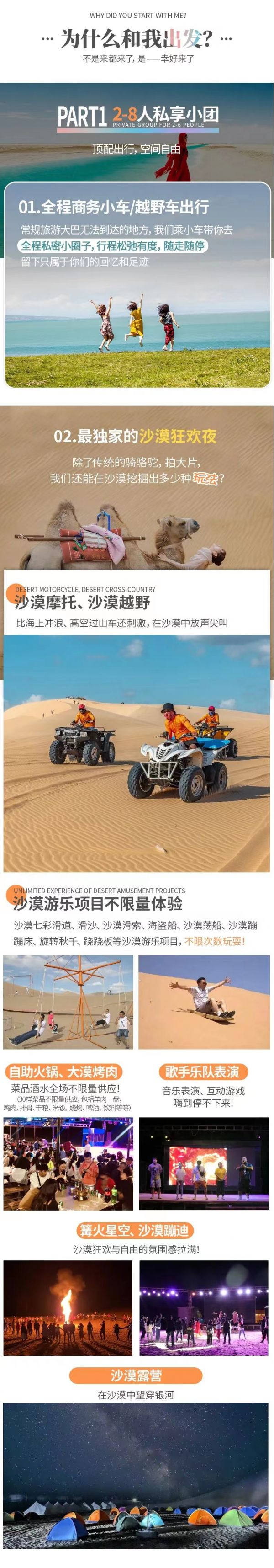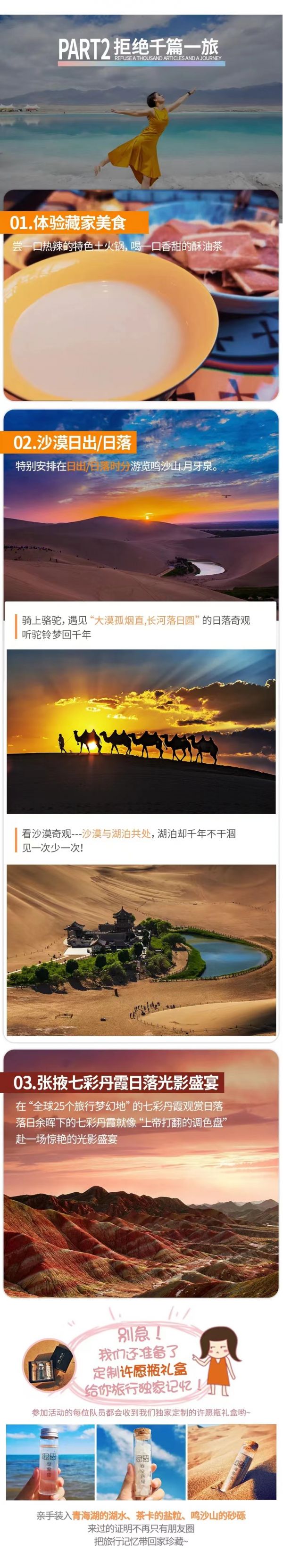 從石油小鎮(zhèn)出來隨后直達(dá)【敦煌】如時(shí)間充??蓞⒂^敦煌古城 ,最后我們抵達(dá)千年古城敦煌,有人說過,這里的風(fēng)都有歷史的氣息。今晚我們特地安排了沙漠露營(yíng)!沙漠露營(yíng)為贈(zèng)送項(xiàng)目,可根據(jù)自己身體狀況自行選擇。包括沙漠摩托、滑沙、土火鍋、啤酒烤肉、沙漠演唱會(huì)、煙花表演、篝火晚會(huì)、鍋莊舞,之后分發(fā)帳篷睡袋在大漠星空下露營(yíng),銀河系清晰可見任何時(shí)節(jié)只要天空晴朗都可看見流星。