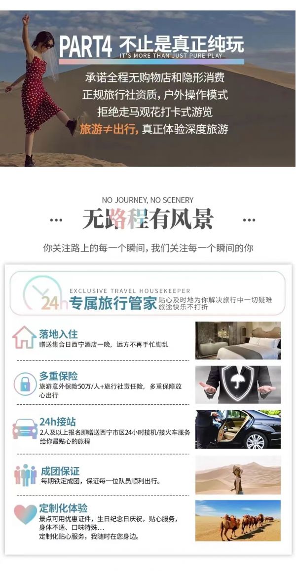 請(qǐng)對(duì)應(yīng)使用我方穿越大西北2-8人VIP私享小團(tuán)9日行程,因使用其它行程造成的投訴,責(zé)任自負(fù);請(qǐng)仔細(xì)閱讀以上行程文檔,同意并保證遵守我方安排,以免為您帶來不必要的麻煩;如產(chǎn)生合同糾紛或人身意外事故,按《中華人民共和國合同法》、《道路交通法》、《保險(xiǎn)賠償條例》裁定;本行程作為旅游合同附頁與旅游合同同等法律效力。