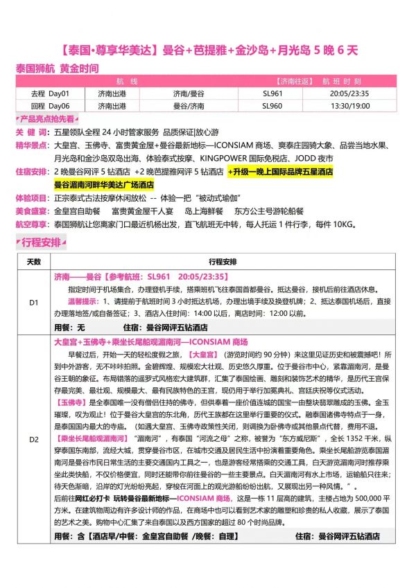 泰國6天5夜游 聊城出發(fā) 純玩 無購物 曼谷 芭提雅 珊瑚島 金沙島 ...... 發(fā)團(tuán)時間 20230609 20230612 價格 2980 報名電話 0635 8681234