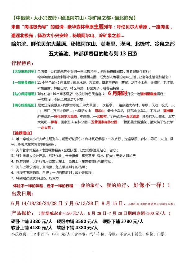 山東向北極光號(hào)主題空調(diào)專列13日游