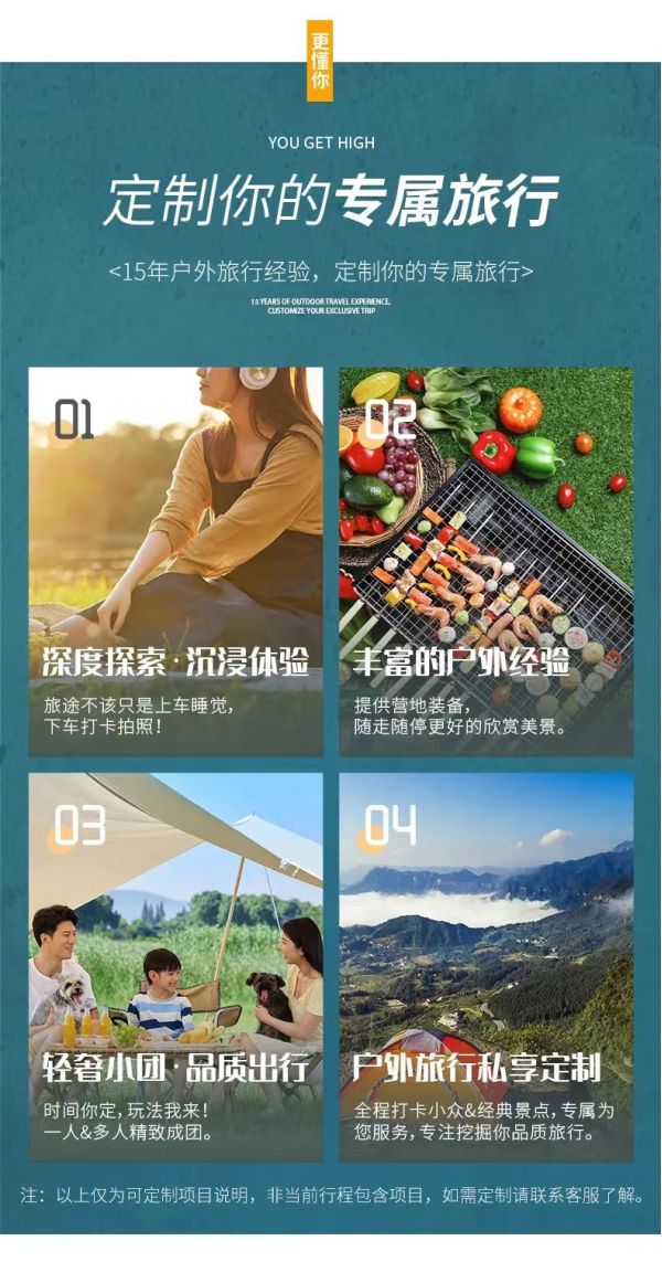 私人訂制:我們業(yè)務(wù)范圍囊括了全國各大城市,川西、西北、西藏、新疆,在路上永遠(yuǎn)有我們的身影。我們將為每一個(gè)有定制需求的你策劃出獨(dú)屬于自己的完美旅行。