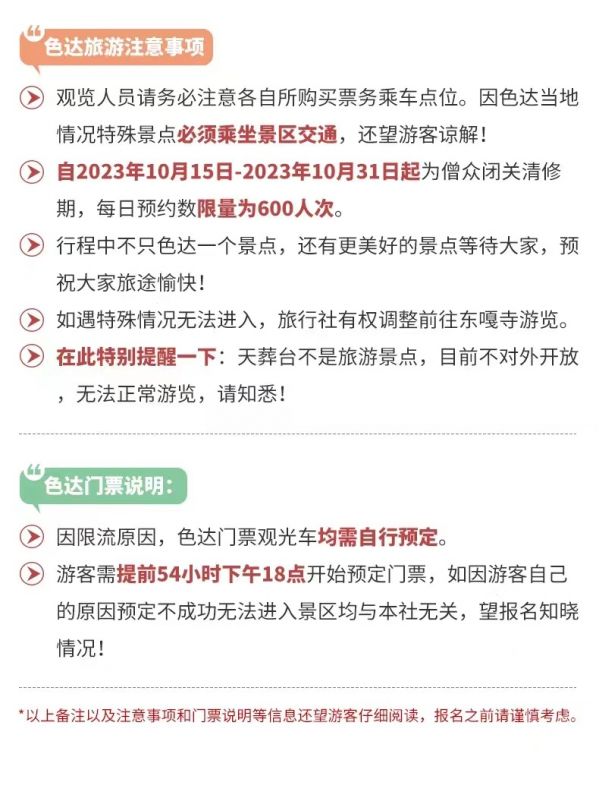 請(qǐng)對(duì)應(yīng)使用我方色達(dá)2-6人VIP自由小團(tuán)5日行程,因使用其它行程造成的投訴,責(zé)任自負(fù);請(qǐng)仔細(xì)閱讀以上行程文檔,同意并保證遵守我方安排,以免為您帶來不必要的麻煩;如產(chǎn)生合同糾紛或人身意外事故,按《中華人民共和國合同法》、《道路交通法》、《保險(xiǎn)賠償條例》裁定;本行程作為旅游合同附頁與旅游合同同等法律效力。