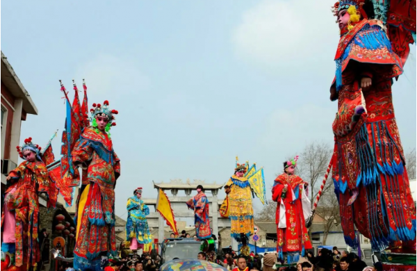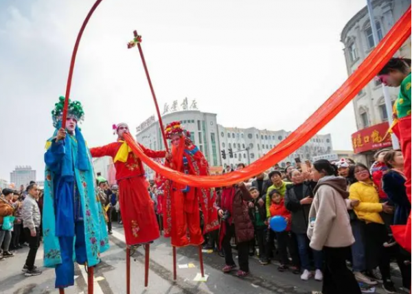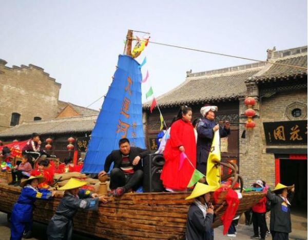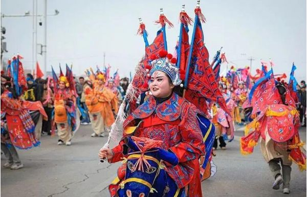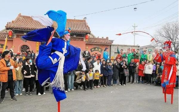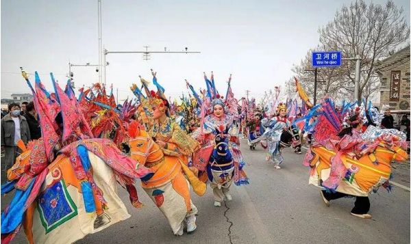人們?yōu)楸苊饣馂模赃@種方式祭祀火神,表達了勞動人民一種辟邪除災、迎祥納福的美好愿望?!盎鹕駨R會”舉辦期間,到處人山人海,傳統(tǒng)節(jié)目有大集街高蹺、軍莊秧歌、背閣、抬閣、八卦秋、武術(shù)表演、竹馬、蓮花燈、火龍、花船等,男女演員盛裝上陣,從臉譜到服裝,無不體現(xiàn)了濃郁的傳統(tǒng)文化色彩。