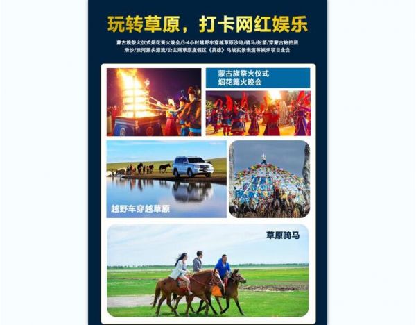 7:煙花篝火晚會、3-4小時越野車穿越草原沙地、騎馬、射箭、穿蒙古袍拍照、滑沙、灤河源頭漂流、公主湖草原度假區(qū)馬術(shù)劇《英雄》震撼的馬戰(zhàn)實景表演等娛樂項目全含。