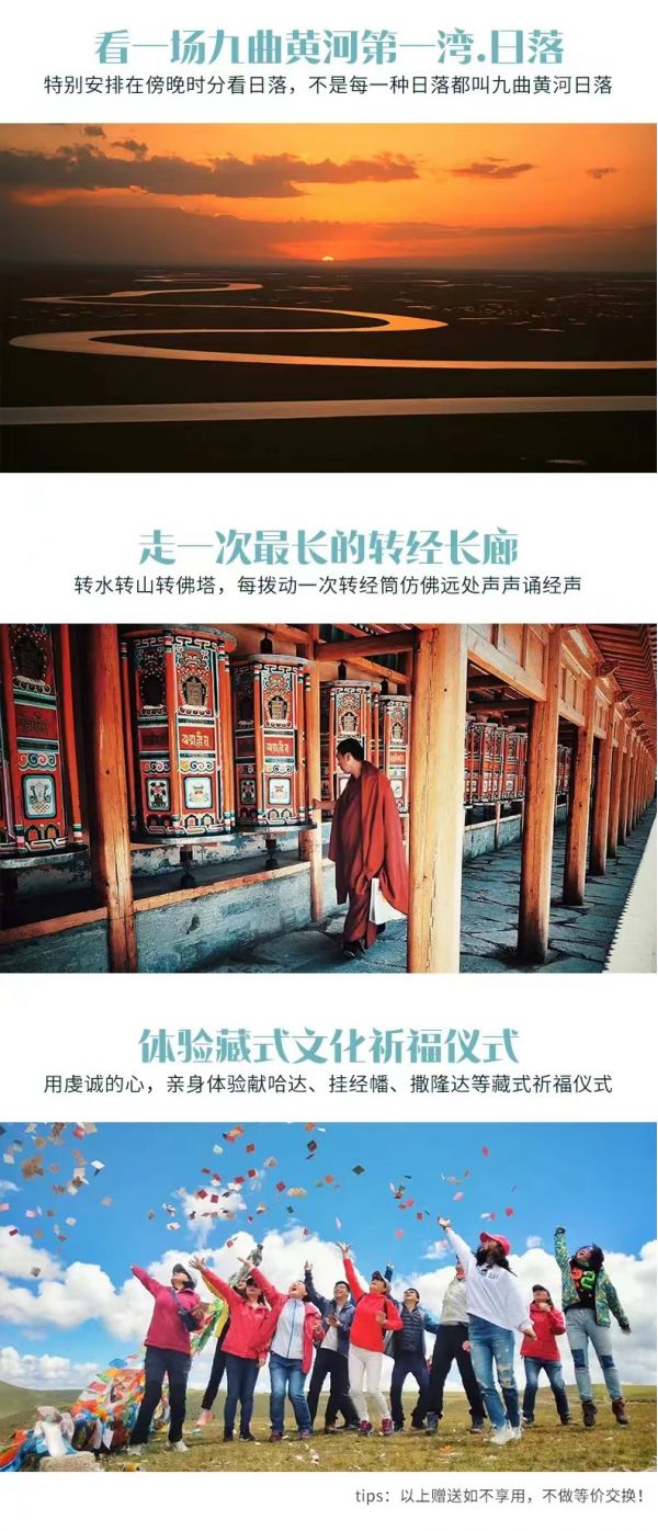 繼續(xù)往前【拉卜楞寺】,有“世界佛學(xué)院”之稱的【拉卜楞寺】。拉卜楞寺是藏傳佛教格魯派六大宗主寺之一 , 規(guī)模僅次于布達(dá)拉宮,是藏傳佛教格魯派最高佛學(xué)學(xué)府之一,被世界譽為“世界藏學(xué)府”,相當(dāng)于我們眼中的“清華北大”。在漫長的發(fā)展中拉卜楞寺形成了獨特的藏傳佛教文化,包括建筑、學(xué)院、法會、佛教藝術(shù)、藏經(jīng)等,曾經(jīng)是甘、青、川毗鄰地區(qū)藏族的政治、宗教、文化中心。在學(xué)院堪布的帶領(lǐng)下來,進(jìn)入寺院,欣賞美麗的壁畫、唐卡,精美佛像;走過朱紅玄黃長廊,和喇嘛一起撥動轉(zhuǎn)經(jīng)筒;在這紅白相間的宏偉寺院中,看虔誠的信徒磕著等身長頭來此轉(zhuǎn)經(jīng);與僧人一起聽經(jīng)、打坐,靜靜感受這份信仰的力量。而后經(jīng)過【瑪曲】,母親河黃河這里自西南入境,復(fù)從西北出境。