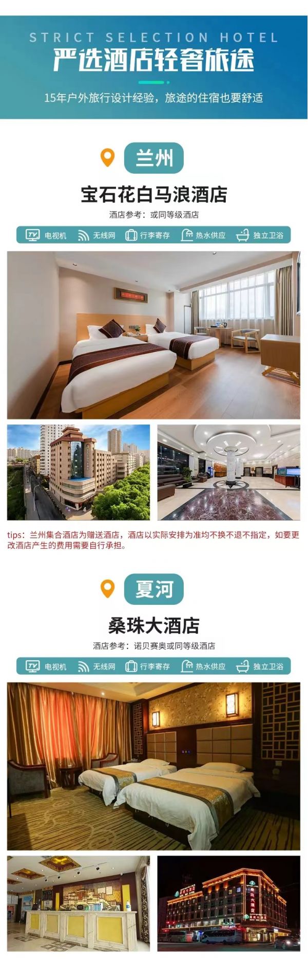 tips:蘭州集合酒店為贈送酒店,酒店以實際安排為準(zhǔn)均不換不退不指定,如要更改酒店產(chǎn)生的費用需要自行承擔(dān)。