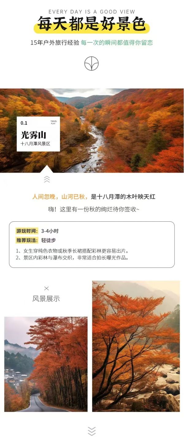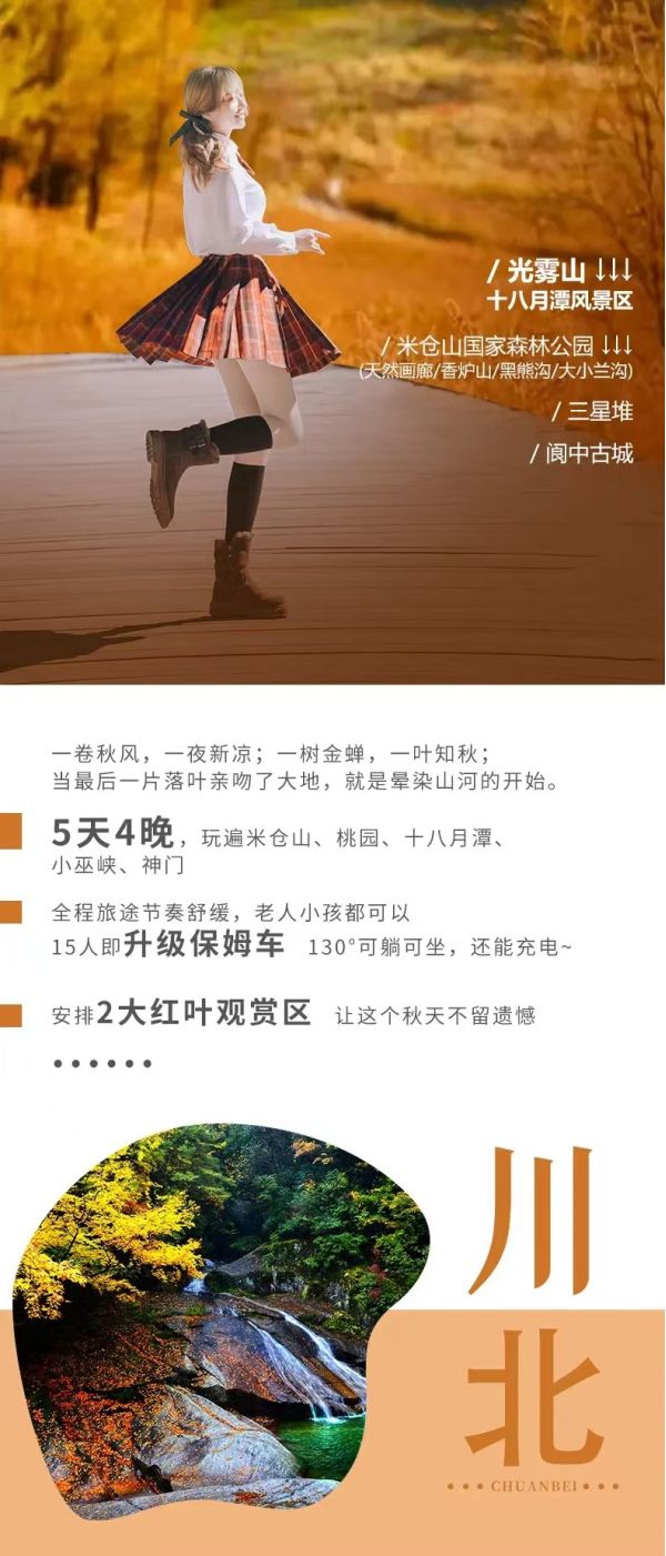 早餐后出發(fā),經(jīng)成巴高速抵達(dá)位于川東北的巴中【光霧山】,光霧山被譽(yù)為“中國(guó)紅葉第一山”,因常年云霧繚繞而得名,每年10月~11月是觀賞光霧山紅葉的最佳時(shí)機(jī)?!臼嗽绿丁渴遣卦诠忪F山深處的動(dòng)人篇章,曾有人說:十八月潭是川東北的“九寨溝”,瀑布似九寨,紅葉絕天下。在長(zhǎng)約3.5公里的珍珠溝內(nèi),密布著18個(gè)恍若神造仙成的瀑潭,每個(gè)潭形似月桂,基本上有一相映的瀑布,謂之“十八月潭”。大小水潭似顆顆珍珠綴成的長(zhǎng)長(zhǎng)珠鏈,沿溝飛瀉的瀑流如粒粒珍珠鋪就的幅幅珠簾。漫步其間,潭水相連,時(shí)而穿過大片彩林,一瀉千里,時(shí)而一片靜謐,明凈幽藍(lán)。登高俯瞰,滿目流金瀉玉、彩虹波動(dòng),尤如串串珍珠藏于溝壑溪澗。步入十八月潭,如在畫中游,讓你陶醉得駐足不前??催^秋景后前往光霧山鎮(zhèn)入住。