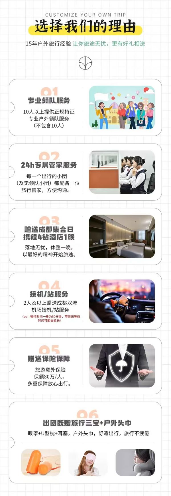 每周三、六發(fā)團(tuán),團(tuán)期如下所示: 第1期:2025年10月12日成都集合——10月16日成都散團(tuán) 第2期:2025年10月16日成都集合——10月20日成都散團(tuán) 第3期:2025年10月19日成都集合——10月23日成都散團(tuán) 第4期:2025年10月23日成都集合——10月27日成都散團(tuán) 第5期:2025年10月26日成都集合——10月30日成都散團(tuán)