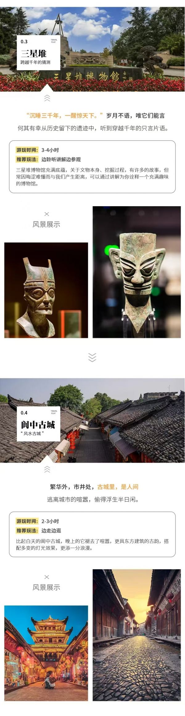 早晨從成都酒店出發(fā),大家相互認(rèn)識(shí),相互熟悉,一路歡歌笑語,充滿期待。隨后抵達(dá)【三星堆博物館】開始參觀,三星堆古遺址距今已有3000至5000年歷史,是迄今在西南地區(qū)發(fā)現(xiàn)的范圍最大、延續(xù)時(shí)間最長(zhǎng)、文化內(nèi)涵最豐富的古城、古國(guó)、古蜀文化遺址。在這批古蜀秘寶中,有許多光怪陸離奇異詭譎的青銅造型,有高2.62米的【青銅大立人】、有寬1.38米的【青銅面具】、更有高達(dá)3.95米的【青銅神樹】等,均堪稱獨(dú)一無二的曠世神品。而以流光溢彩的金杖為代表的金器,以滿飾圖案的邊璋為代表的玉石器,亦多屬前所未見的稀世之珍。游覽后繼續(xù)出發(fā),下午抵達(dá)【閬中古城】,古城山圍四面,水繞三方,有著2300多年的歷史,與安徽黃山的徽州古城、山西平遙的平遙古城和云南麗江的麗江古城并稱為中國(guó)四大古城,如果說麗江古城是風(fēng)花雪月,那么閬中古城便是人間煙火,古城里時(shí)不時(shí)飄出的陣陣醋香更是久久縈繞在心頭,古城所蘊(yùn)含的三國(guó)文化、春節(jié)文化、科舉文化更是值得深入探究。晚上我們?nèi)胱」懦侵苓?,比起白天的閬中古城,晚上的它褪去了喧囂,更具東方建筑的古韻,搭配多變的燈光效果,更添一分浪漫。