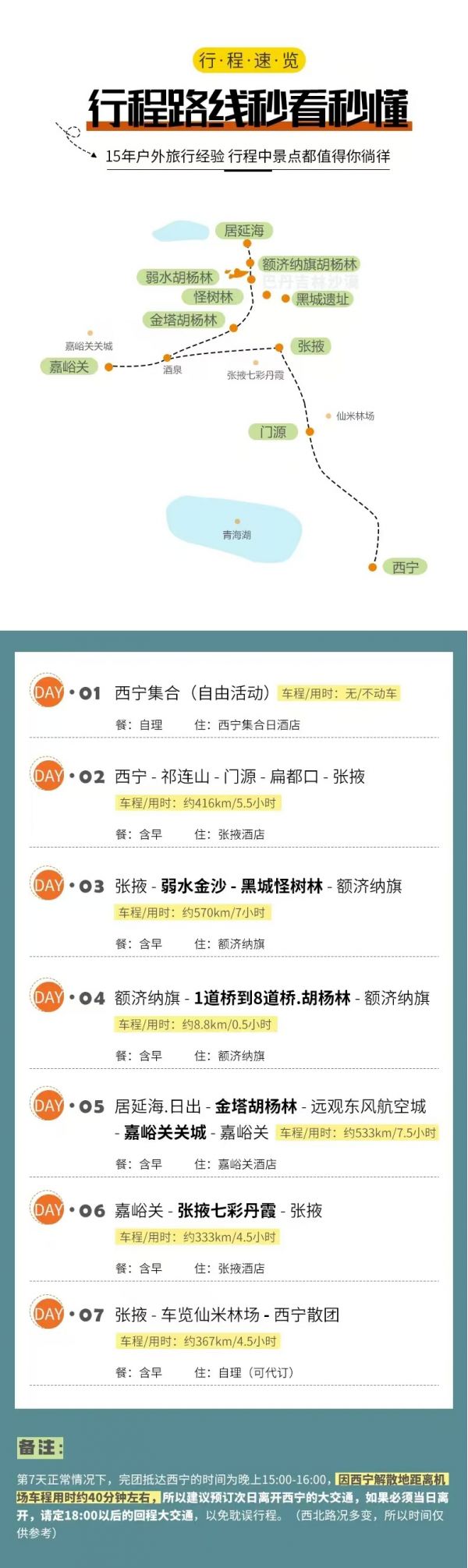 備注請對應使用我方額濟納7日行程,因使用其它行程造成的投訴,責任自負;請仔細閱讀以上行程文檔,同意并保證遵守我方安排,以免為您帶來不必要的麻煩;如產(chǎn)生合同糾紛或人身意外事故,按《中華人民共和國合同法》、《道路交通法》、《保險賠償條例》裁定;本行程作為旅游合同附頁與旅游合同同等法律效力。
