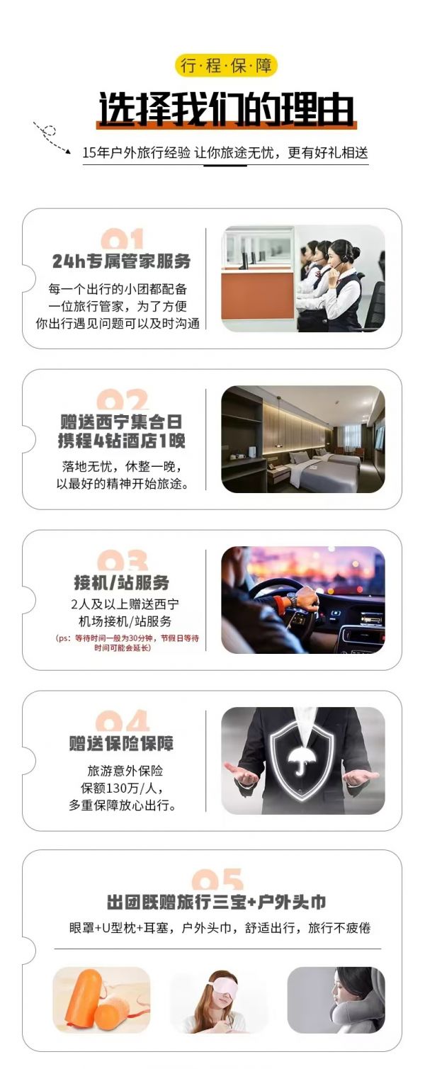 接機/站服務:本次活動提供西寧市內(nèi)24小時接機/接站服務,工作人員會在您出發(fā)日期前一天21:30之前向您推送消息并與您聯(lián)系,如果超過時間沒有接到任何通知,請及時與報名處聯(lián)系。(接站等待時間一般為15-20分鐘,最長不超30分鐘,節(jié)假日拼單人數(shù)較多情況下客人等待時間可能會延長)。