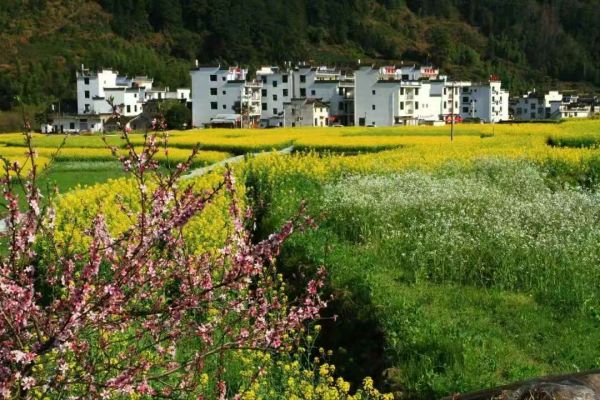 金黃色的花兒從層層梯田沿著山谷流成了海洋。粉墻黛瓦的村落里桃花紅、梨花白,還有那滿山的樹木和曲折幽靜的小路。