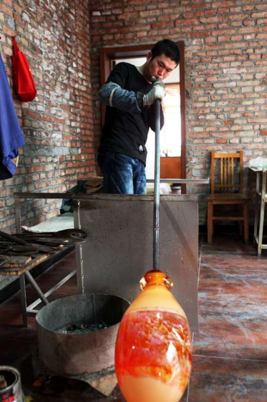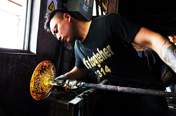 全程拍攝大爐琉璃制作,博山是琉璃之鄉(xiāng),保留傳承了琉璃加工的傳統(tǒng)技藝,并在此基礎(chǔ)上又自己的開拓創(chuàng)新。琉璃的制作工藝相當(dāng)復(fù)雜,火里來、水里去,要幾十道工序才能完成,古法琉璃的精品制作,相當(dāng)費(fèi)時(shí),有的光制作過程就要十幾二十天,而且主要依靠手工制作。八卦爐,爐里的溫度在1400-1600度,工作車間內(nèi)的溫度能達(dá)到50攝氏度左右。還有傳說琉璃是一個(gè)叫路申的博山人在用八卦爐煉丹的時(shí)候偶然發(fā)現(xiàn)的,觀其在經(jīng)過烈火煅燒之后還可以晶瑩剔透,遂以長(zhǎng)生不老之丹為名進(jìn)獻(xiàn)給當(dāng)時(shí)的國(guó)君,并置于朝堂以消滅災(zāi)禍。所以佩戴琉璃小飾品還有去災(zāi)避禍的用處。大師提取原料吹制的過程,都是大師們用空心的管根據(jù)顏色的需要從爐口中提取,然后用空心管吹制。在吹制的過程中,溫度就會(huì)下降,然后再上回溫爐進(jìn)行加工。