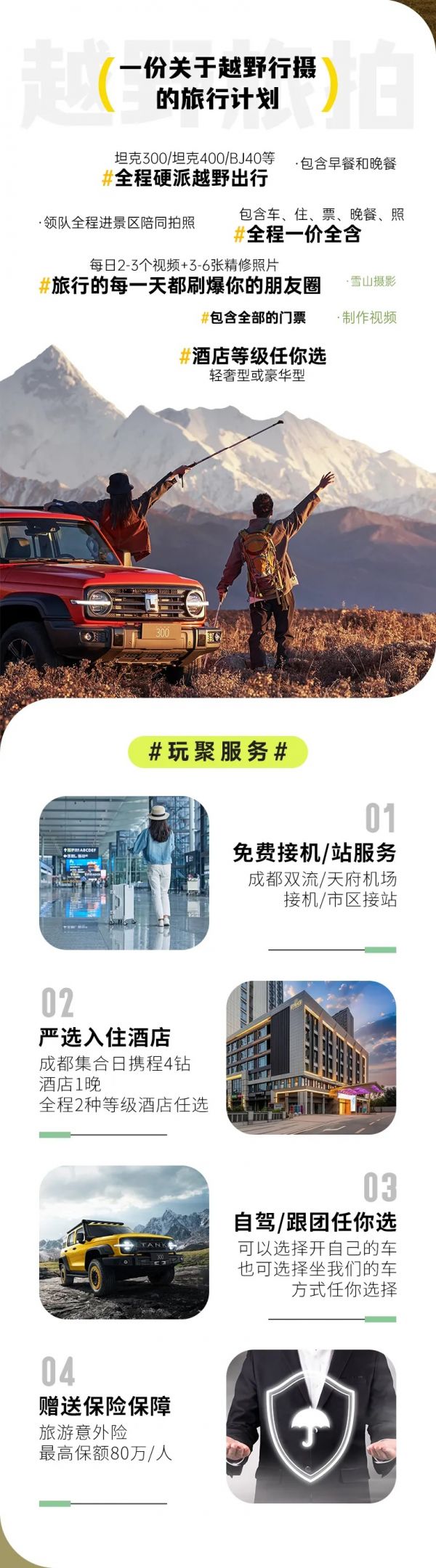 全程安排硬派越野車,車型不指定保證安排越野越野車出行,保證每人一正座;