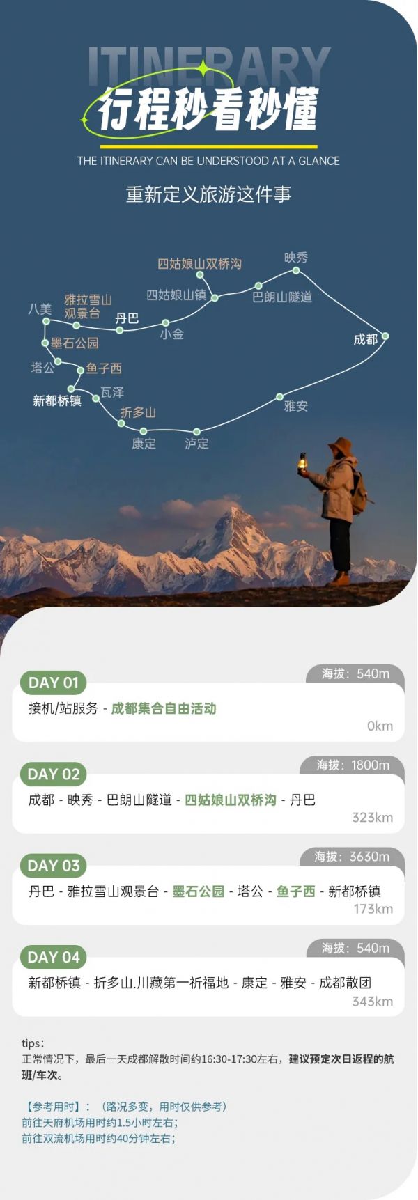 由于川西地區(qū)路況復(fù)雜,山道狹窄,有可能因?yàn)槎萝嚩l(fā)生延誤,請大家盡量預(yù)定第二天返程的航班或車次。