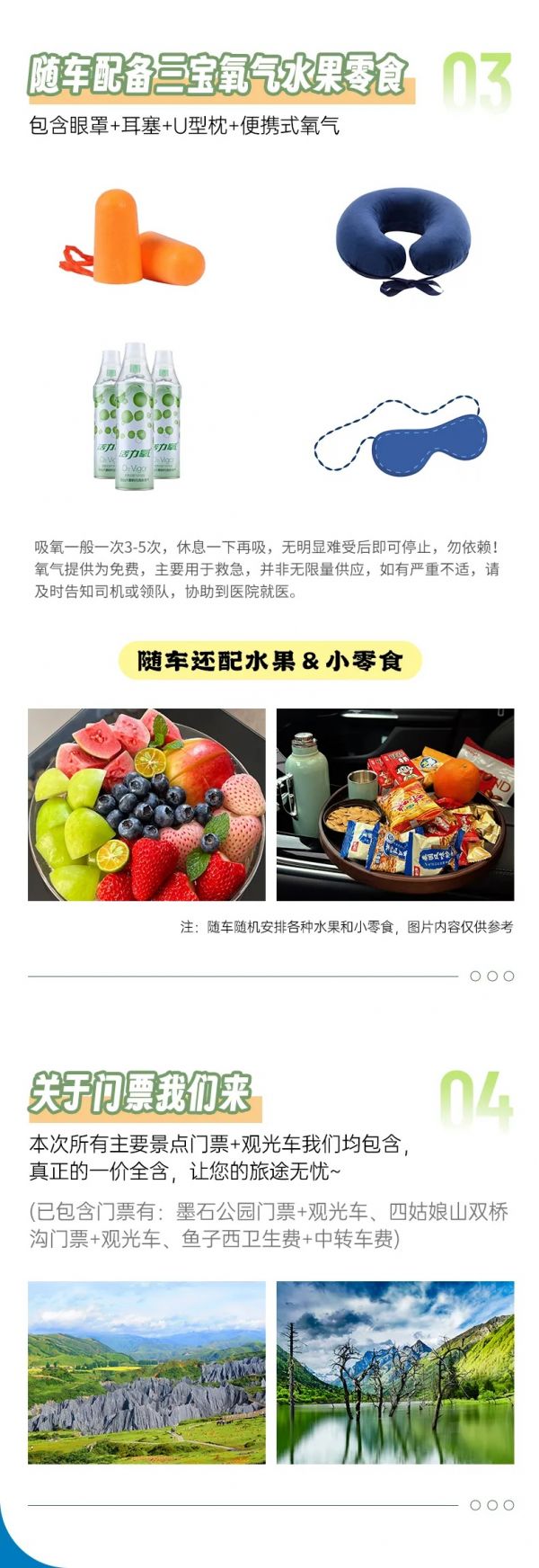 門票:包含墨石公園門票+觀光車、四姑娘山雙橋溝門票+觀光車、魚子西衛(wèi)生費(fèi)+中轉(zhuǎn)車費(fèi)(原車中轉(zhuǎn)不去不退費(fèi))