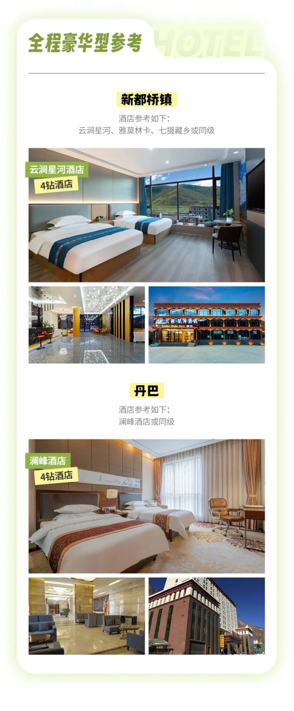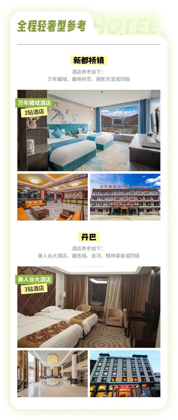 住宿:行程所列住宿地3晚住宿(輕奢型和豪華型酒店任選其一,具體價(jià)格詳情查看團(tuán)期價(jià)格或咨詢客服了解詳情),每人1床位(含成都集合日4鉆酒店1晚、不住不退不換不指定)具體了解團(tuán)期價(jià)格。