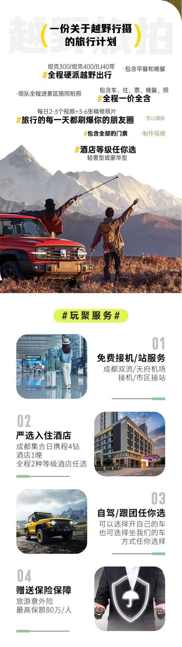 全程安排硬派越野車(chē),車(chē)型不指定保證安排越野越野車(chē)出行,保證每人一正座;