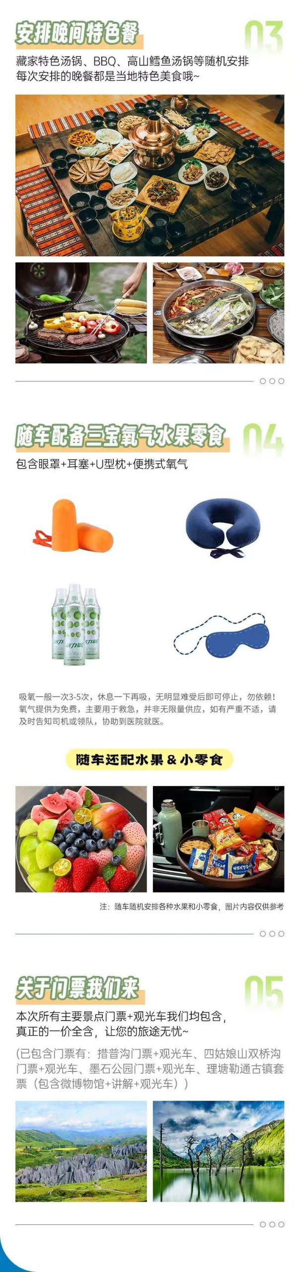 包含措普溝門(mén)票+觀光車(chē)、四姑娘山雙橋溝門(mén)票+觀光車(chē)、墨石公園門(mén)票+觀光車(chē)、理塘勒通古鎮(zhèn)套票(包含微博物館+講解+觀光車(chē))