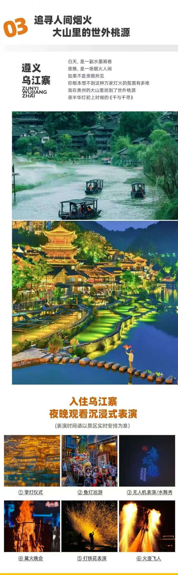 入住烏江寨。沉浸式表演之夜(以景區(qū)實時安排為準(zhǔn)):