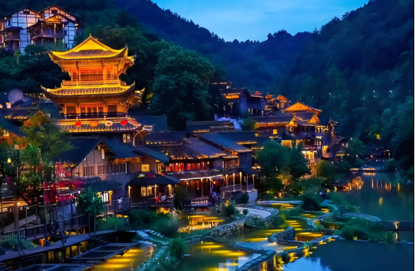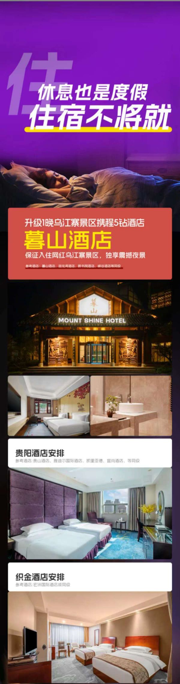 下午:午餐后乘車前往【烏江寨】國際旅游度假區(qū),車程約2.5H(景區(qū)電瓶車已包含,不限次數(shù)乘坐),江南千條水,云貴萬重山,一灣烏江碧水飄落在山間,如黛青山擁簇著烏江寨,兩岸吊腳樓錯(cuò)落有致,滿滿的黔北風(fēng)情,宛若治愈力拉滿的世外桃源,青山、綠水、吊腳樓、青磚黛瓦、民居、民俗、水舞秀...描繪出一幅黔北民居群落的壯美畫卷,在太乙閣碼頭坐上一艘搖櫓船,穿行在氤氳水汽之間,鱗次櫛比的吊腳樓撲面而來,斜倚船頭,坐看云煙升騰,晨光下的美景猶如一幅水墨畫在眼前暈染開來。景區(qū)是集觀光、休閑、度假、康養(yǎng)、會(huì)展為一體的大型綜合業(yè)態(tài)的旅游目的地。景區(qū)內(nèi)辦理入住酒店后自由游覽,晚上景區(qū)內(nèi)可以欣賞震撼壯觀的水舞秀、燈光秀、獨(dú)竹飄,無人機(jī)編隊(duì)表演等。