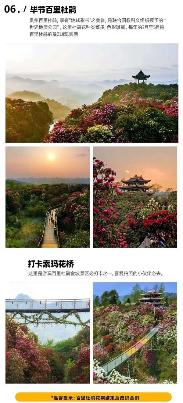 1、每年3-4月行程安排為百里杜鵑景區(qū),花期過后百里杜鵑景區(qū)替換成織金洞景區(qū),不同時(shí)安排游覽兩個(gè)景點(diǎn)。