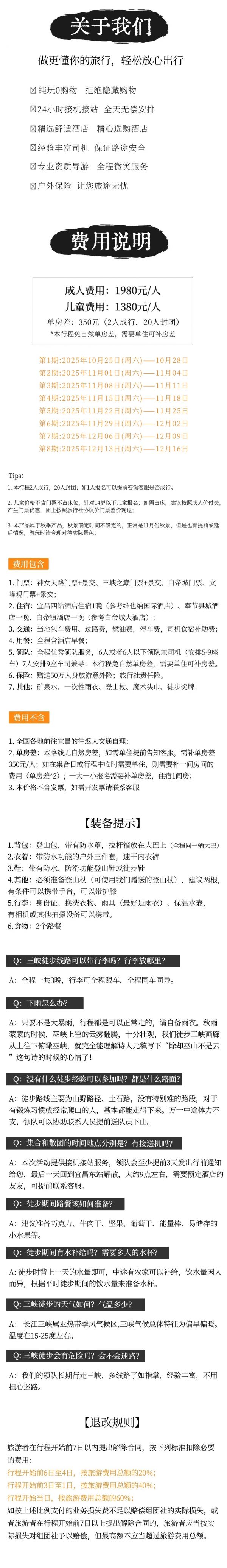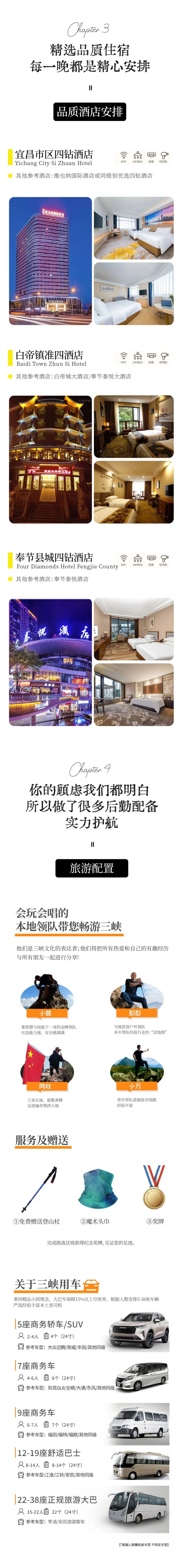 A:本次活動(dòng)提供接機(jī)接站服務(wù),領(lǐng)隊(duì)會(huì)至少提前3天發(fā)出行前通知給您,最后一天回到宜昌東站解散,大約9點(diǎn)左右,需要預(yù)定酒店的友友,可提前聯(lián)系客服