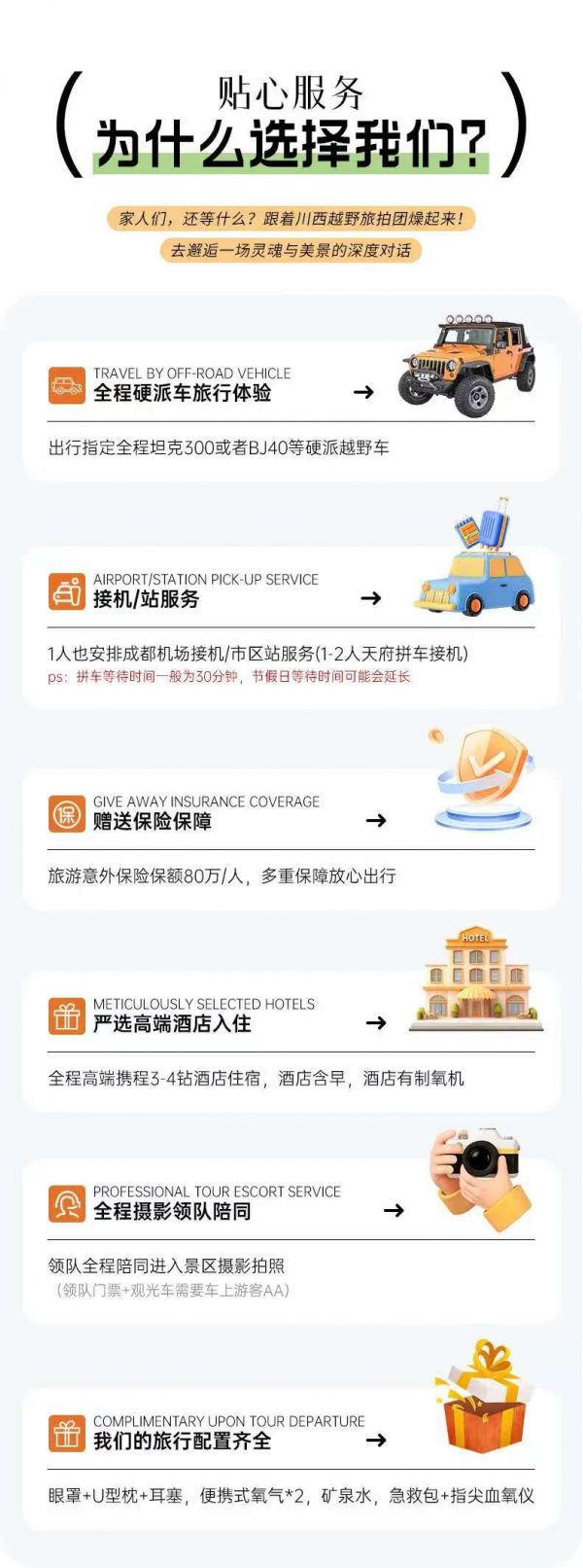 包含80w旅游意外險(xiǎn)(不含財(cái)產(chǎn)險(xiǎn));包含成都機(jī)場(chǎng)接機(jī)/市區(qū)接站服務(wù)1次(1-2人安排天府機(jī)場(chǎng)拼車(chē)接機(jī))。
