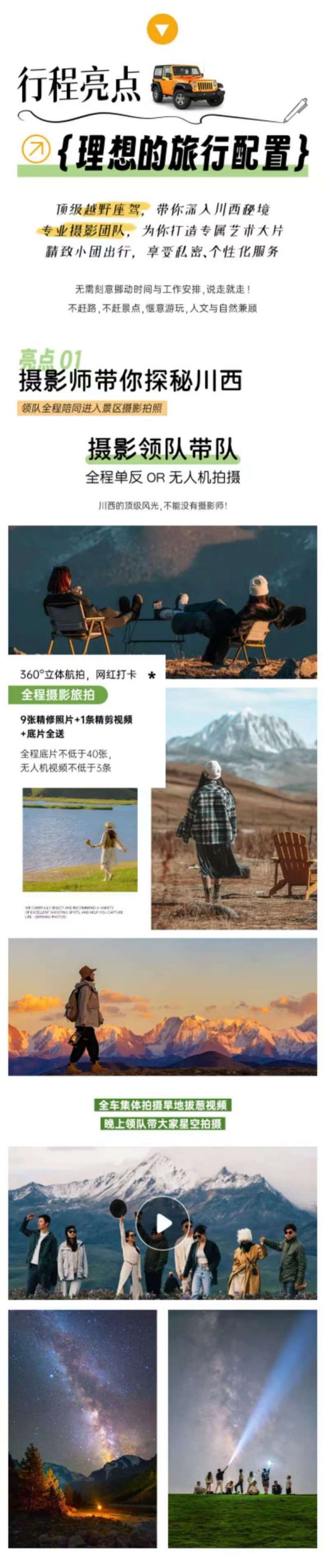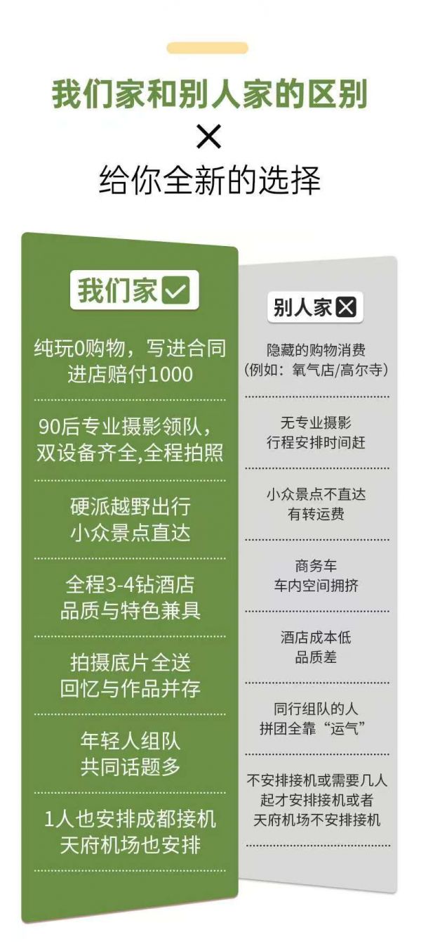 無(wú)人機(jī)+單反旅拍(底片全送+9張精修照片+1條精剪視頻),底片全程不低于40張,無(wú)人機(jī)視頻不低于3條(全車(chē)人拍攝旱地拔蔥視頻,晚上領(lǐng)隊(duì)帶大家星空拍攝);贈(zèng)送藏服旅拍(6張底片+3張精修),全場(chǎng)衣服通選(除了三款羊皮襖)+精妝+精造;隨車(chē)便攜式氧氣瓶每人2瓶、旅行三寶1套/人、撒隆達(dá)1份;隨車(chē)配備礦泉水、急救包、指尖血氧儀;贈(zèng)送特色土火鍋+篝火晚會(huì)+藏族歌舞表演晚會(huì);可免費(fèi)提供露營(yíng)桌椅板凳爐具,可以野餐(食材車(chē)上游客一起AA),需提前預(yù)約;體驗(yàn)藏區(qū)文化特色-畫(huà)唐卡;