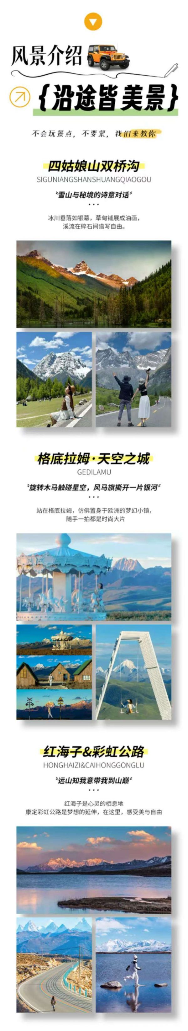 門票預(yù)估:紅海子15-30元/人;魚子西/格底拉姆/八郎生都30元/人;貢嘎雪山埡口0-260元/人;木雅大寺15元/人;四姑娘山雙橋溝門票80元/人、觀光車70元/人。