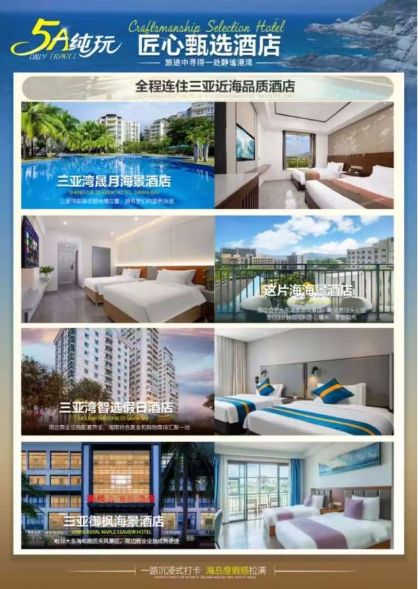 *酒店安排:三亞灣晟月海景酒店園景房/這片海海景酒店豪華房/三亞御楓海景酒店甄享房/三亞灣智選假日酒店/三亞凱瑞萊海景度假酒店園景房或同級(jí)