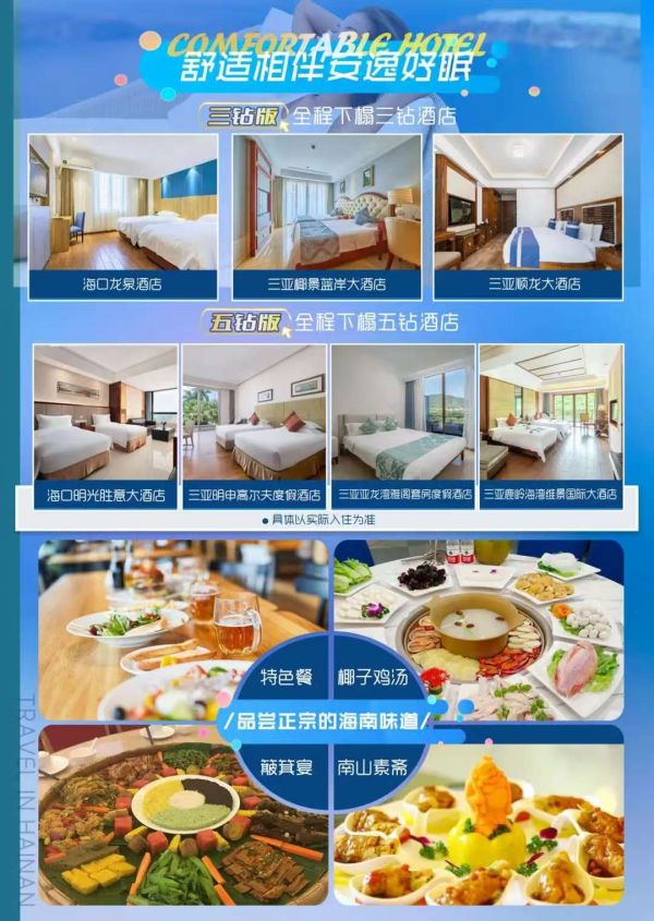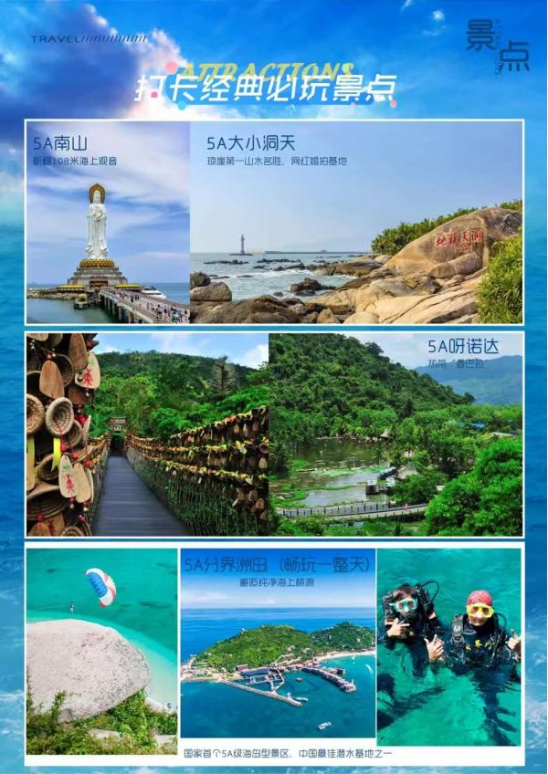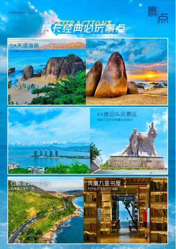 【大小洞天】國家5A級景區(qū)(時間不少于120分鐘):至今已有800多年歷史。大小洞天融匯了秀麗的海景、山景和石景,既可以看到“小洞天”、“海山奇觀”、“仙人足”等摩崖石刻,還能參觀號稱植物中的“活化石”南山不老松。【天涯海角】國家5A級景區(qū)(游覽時間不少于120分鐘):情侶們神往的圣地,不僅有南天一柱,日月神石,豐富的打卡點能戳中你所有的浪漫神經(jīng),小紅書火出圈的天涯書局、火車、情侶樹,還有婚拍基地的教堂、熱氣球、粉色城堡都超級出片。